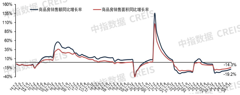 需求:1-11月新建商品房销售面积8.6亿平米,同比着落14.3%,降幅较1-10月收窄1.5个百分点;新建商品房销售额8.5万亿元,同比着落19.2%