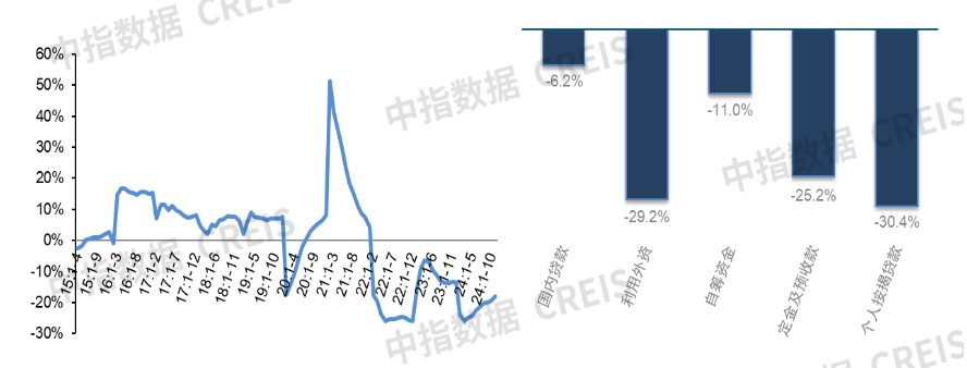 图:2015年于今天下房企到位资金同比增速及2024年1-11月各项资金起首同比增速对比