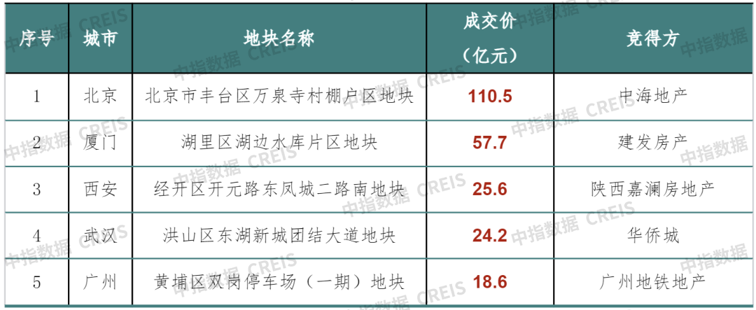 宅地总价TOP5:北京地块宅地成交价居首位,TOP5中一线城市地块占两席。