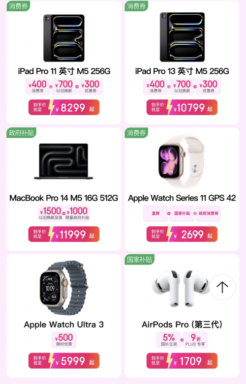 Apple Watch系列也带来惊喜价钱。GPS款42毫米Apple Watch Series 11低至2699元起、GPS款+蜂窝款49毫米Apple Watch Ultra3低至5999元起。关于念念伊始AirPods的果粉可奏凯伊始,PLUS会员可领取9折优惠券,AirPods 4重叠国补和9折专属福利后,PLUS会员得手机只需799.2元起;AirPods Pro(第三代)享国补立减5%、PLUS专享9折福利,得手低至1709元起。