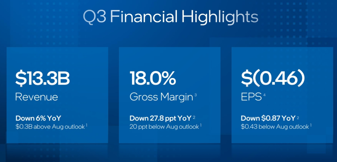 英特尔三季度营收132.8亿好意思元,高于分析师此前预期的130.2亿好意思元;调养后每股去世46好意思分,分析师预期为去世2好意思分,上年同期为每股盈利41好意思分。此外,当季经调养毛利率18%,分析师预期38%。