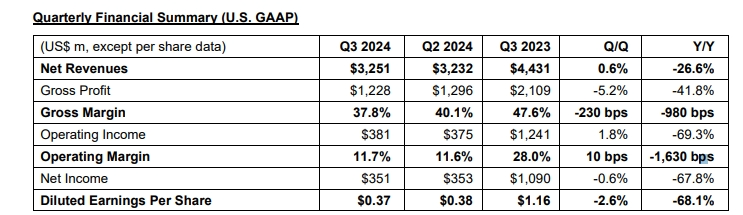 意法半导体第三季度营收32.5 亿好意思元,同比裁减27%,分析师的平均预期为32.4 亿好意思元;净利润3.51亿好意思元,同比裁减67.8%;摊薄后每股收益为0.37好意思元,上年同期为1.16好意思元。
